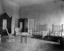 In 1902, Edith hired McKim, Mead & White to separate the living quarters from the offices, to enlarge and modernize the public rooms, to re-do the landscaping, and to redecorate the interior.[7] Congress approved over half a million dollars for the renovation.[10] The new West Wing housed offices while the East Wing housed the president's family and guests.[10] The plumbing, lighting, and heating were upgraded.[10] Edith placed her office next door to Teddy's so that they could confer frequently throughout the day.[12]