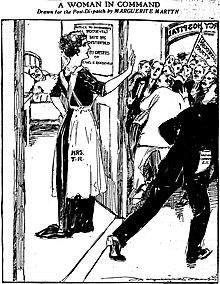 Among the responses to the dinner was a cartoon created by Maryland Democrats in which Edith sat between Teddy and Booker.[2] The cartoon was widely reprinted.[2] According to Deborah Davis, this was the first time that a First Lady was lampooned in print.[2]