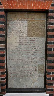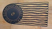 Halley succeeded John Flamsteed in 1720 as Astronomer Royal, a position Halley held until his death in 1742 at the age of 85.[5] He was buried in the graveyard of the old church of St Margaret's, Lee (since rebuilt), at Lee Terrace, Blackheath.[37] He was interred in the same vault as the Astronomer Royal John Pond; the unmarked grave of the Astronomer Royal Nathaniel Bliss is nearby.[38] His original tombstone was transferred by the Admiralty when the original Lee church was demolished and rebuilt – it can be seen today on the southern wall of the Camera Obscura at the Royal Observatory, Greenwich. His marked grave can be seen at St Margaret's Church, Lee Terrace.[39][40]