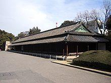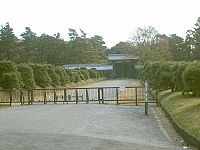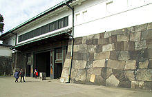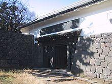 Hirakawa-mon (平川門) is said to have been the main gate to the Sannomaru of Edo Castle. It is also said to have been the side gate for maidservants and therefore called the Otsubone-mon. The shape of this gate is in the masugata, similar to the Ōte-mon. However a watari-yagura-mon is built to an adjacent left angle within the kōrai-mon, of which it has two. The other kōrai-mon is to the west of the watari-yagura-mon which was used as the "gates of the unclean" for the deceased and criminals from within the castle.[11] Outside this gate is a wooden bridge with railings crowned with giboshi-ornamental tops.