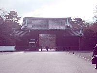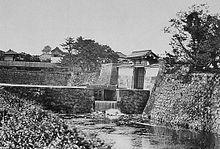 After the capitulation of the shogunate in 1867, the inhabitants and shōgun had to vacate the premises. The castle compound was renamed Tokyo Castle (東京城, Tōkei-jō)[7] in October, 1868, and then renamed Imperial Castle (皇城, Kōjō) in 1869. In the year Meiji 2 (1868), on the 23rd day of the 10th month of the Japanese calendar the emperor moved to Tokyo and Edo castle became an imperial palace.[8]