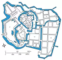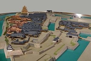 Initially, parts of the area were lying under water. The sea reached the present Nishinomaru area of Edo Castle, and Hibiya was a beach. The landscape was changed for the construction of the castle.[4] Most construction started in 1593 and was completed in 1636 under Ieyasu's grandson, Tokugawa Iemitsu. By this time, Edo had a population of 150,000.[5]