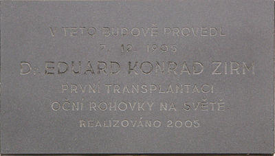 In 1905, Zirm encountered a patient Alois Glogar, a 45-year-old day farm labourer from a small town in the Czech Republic whose corneas in both eyes had turned white-gray and opaque a year earlier while working with slaking lime. Around the same time he examined Glogar, an 11-year-old boy named Karl Brauer was brought to Zirm's clinic with penetrating eye-injury to both eyes and iron metal foreign bodies irretrievably lodged in his eyes. When attempts to save Brauer's eyes were unsuccessful, Zirm, with the boy's father's permission[1] enucleated them and saved the corneas for transplantation into Glogar's. Although complications affected one eye, the other remained clear allowing Glogar to return to work.[2]