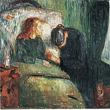 As Edvard remembered it, Christian's positive behavior toward his children was overshadowed by his morbid pietism. Munch wrote, "My father was temperamentally nervous and obsessively religious—to the point of psychoneurosis. From him I inherited the seeds of madness. The angels of fear, sorrow, and death stood by my side since the day I was born."[5] Christian reprimanded his children by telling them that their mother was looking down from heaven and grieving over their misbehavior. The oppressive religious milieu, Edvard's poor health, and the vivid ghost stories helped inspire his macabre visions and nightmares; the boy felt that death was constantly advancing on him.[6] One of Munch's younger sisters, Laura, was diagnosed with mental illness at an early age. Of the five siblings, only Andreas married, but he died a few months after the wedding. Munch would later write, "I inherited two of mankind's most frightful enemies—the heritage of consumption and insanity."[7]
