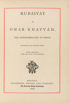 Beginning in 1859, FitzGerald authorized four editions (1859, 1868, 1872 and 1879) and there was a fifth posthumous edition (1889) of his translation of the Rubáiyát of Omar Khayyám (Persian: رباعیات عمر خیام). Three (the first, second, and fifth) differ significantly; the second and third are almost identical, as are the fourth and fifth. The first and fifth are reprinted almost equally often,[20][21] and equally often anthologized.[22]