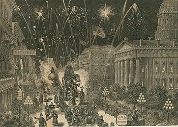 Jump was living in St. Louis in 1878 and assigned to make sketches for Frank Leslie's Weekly of the first Veiled Prophet Parade and Ball when he was hurt badly by two hoodlums who took a wallet, a ring, and sketches of the ball.[9] Nevertheless, Jump was able to finish his drawing of the parade (above), and it was published in the Weekly.