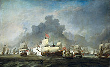 In Autumn 1690, Russell blamed the Dutch for the failure of the allies to enforce the blockade of France and was forced to stand down as a Lord Commissioner in January 1691.[6] Flying his flag in the first-rate HMS Britannia, he was Commander-in-Chief of the Anglo-Dutch force that fought the French fleet at the Battle of Barfleur in May 1692, during the Nine Years' War. At about 10am the French Admiral the Comte de Tourville, with his flag in the French ship Soleil Royal, attacked Russell's flagship but around 1pm, Tourville was forced to disengage with extensive damage to his rigging and sails.[7] Russell then destroyed much of the French fleet, in a night attack at the Battle of La Hogue in June 1692.[2]