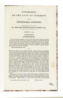 After practising for some years as a conveyancer, Sugden was called to the bar at Lincoln's Inn in 1807, having already published his well-known Concise and Practical Treatise on the Law of Vendors and Purchasers of Estates. In 1822 he was made King's Counsel. He was returned at different times for various boroughs to the House of Commons, where he made himself prominent by his opposition to the Reform Bill of 1832.[1] He was appointed Solicitor General in 1829, receiving the customary knighthood.[2] As Solicitor-General he took a narrow view of Jewish emancipation, arguing that "They had possessed nothing; they held nothing. They had no civil rights; they never had any."[3]