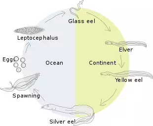 Eels begin life as flat and transparent larvae, called leptocephali. Eel larvae drift in the surface waters of the sea, feeding on marine snow, small particles that float in the water. Eel larvae then metamorphose into glass eels and then become elvers before finally seeking out their juvenile and adult habitats.[3] Many eels remain in the sea throughout their lives, but freshwater elvers of eels in the family Anguillidae travel upstream and are forced to climb up obstructions, such as weirs, dam walls, and natural waterfalls.