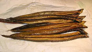 Freshwater eels (unagi) and marine eels (conger eel, anago) are commonly used in Japanese cuisine; foods such as unadon and unajū are popular, but expensive. Eels are also very popular in Chinese cuisine, and are prepared in many different ways. Hong Kong eel prices have often reached 1000 HKD (128.86 US Dollars) per kg, and once exceeded 5000 HKD per kg. The European eel and other freshwater eels are mostly eaten in Europe, the United States, and other places. Today, the european eel is considered critically endangered.[25] A traditional east London food is jellied eels, although the demand has significantly declined since World War II. The Spanish cuisine delicacy angulas consists of elver (young eels) sautéed in olive oil with garlic; elvers usually reach prices of up to 1000 euro per kg.[26] New Zealand longfin eel is a traditional Māori food in New Zealand. In Italian cuisine, eels from the Valli di Comacchio, a swampy zone along the Adriatic coast, are especially prized, along with freshwater eels of Bolsena Lake and pond eels from Cabras, Sardinia. In northern Germany, the Netherlands, the Czech Republic, Poland, Denmark, and Sweden, smoked eel is considered a delicacy.