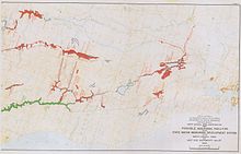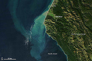 Most of the Eel River watershed is underlain by sedimentary rock of the Franciscan Assemblage (or Complex), whose rocks date back to the Late Jurassic (161–146 million years ago).[17] The Franciscan is part of a terrane, or crustal fragment, that originated at the bottom of the Pacific Ocean. Beginning several million years ago, tectonic forces shoved the Franciscan assemblage against the North American Plate, pushing up the Coast Ranges.[18] The Eel River basin is among the most seismically active areas in California, especially in the north (the river empties into the Pacific only several miles north of Cape Mendocino near the Mendocino Triple Junction, which marks the northern end of the San Andreas Fault and produces frequent earthquakes due to the juncture here of three tectonic plates).[19] In the western and northern portions of the Eel River watershed, soils eroded from the Franciscan assemblage are often sticky, clayey and highly unstable, creating a high risk of landslides.[18] This soil is often known as "blue goo" because of its gray-blue texture and its tendency to slip when saturated.[20] Further inland and south, soils are well drained, although landslides are nevertheless common because of the high rainfall and steep slopes.[18]