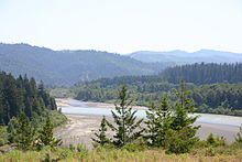 The Eel River watershed lies within the Oregon and Northern California Coastal freshwater ecoregion, which is characterized by temperate coniferous forests consisting largely of Douglas fir and western hemlock.[37] The watershed also contains many stands of Redwood that are among the largest such trees in California. In the Eel River basin, redwoods can be found further inland than other parts of the northern California coast because of the wide lower valley of the river, which acts like a funnel conducting moist air eastwards from the coast. However, redwood groves are still most common in the drainage area of the South Fork Eel River, which lies closest to the Pacific.[38]