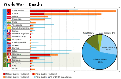 The Soviet Union suffered enormous losses in the war against Germany. The Soviet population decreased by about 27 million during the war; of these, 8.7 million were combat deaths. The 19 million non-combat deaths had a variety of causes: starvation in the siege of Leningrad; conditions in German prisons and concentration camps; mass shootings of civilians; harsh labour in German industry; famine and disease; conditions in Soviet camps; and service in German or German-controlled military units fighting the Soviet Union.[5] The population would not return to its pre-war level for 30 years.[6]