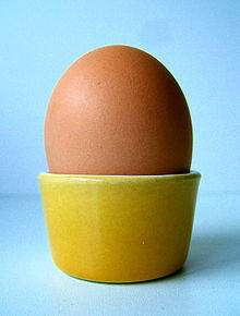 An egg cup, sometimes called an egg server, is an item of tableware used for serving and holding boiled eggs within their shell. Egg cups have an upwardly concave portion to hold the egg and a flat-bottomed base. Egg cups can be made from a variety of materials, including bakelite, glass, plastic, porcelain, pottery, various metals. and wood, or a combination of two materials, such as ceramic and wood.