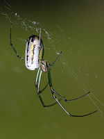 Only three classes of pigment (ommochromes, bilins and guanine) have been identified in spiders, although other pigments have been detected but not yet characterized. Melanins, carotenoids and pterins, very common in other animals, are apparently absent. In some species, the exocuticle of the legs and prosoma is modified by a tanning process, resulting in a brown coloration.[46] Bilins are found, for example, in Micrommata virescens, resulting in its green color. Guanine is responsible for the white markings of the European garden spider Araneus diadematus. It is in many species accumulated in specialized cells called guanocytes. In genera such as Tetragnatha, Leucauge, Argyrodes or Theridiosoma, guanine creates their silvery appearance. While guanine is originally an end-product of protein metabolism, its excretion can be blocked in spiders, leading to an increase in its storage.[46] Structural colors occur in some species, which are the result of the diffraction, scattering or interference of light, for example by modified setae or scales. The white prosoma of Argiope results from bristles reflecting the light, Lycosa and Josa both have areas of modified cuticle that act as light reflectors.[46]