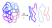 The second stress comes from the mixing of air into the whites, which causes the proteins to come out of their natural state. These denatured proteins gather together where the air and water meet and create multiple bonds with the other unraveled proteins, and thus become a foam, holding the incorporated air in place, because the proteins consist of amino acids; some are hydrophilic (attracted to water) and some are hydrophobic (repelled by water). This process is called coagulation.[6][3]