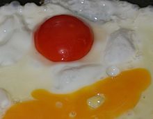 As food, the chicken egg yolk is a major source of vitamins and minerals. It contains all of the egg's fat and cholesterol, and nearly half of the protein. If left intact when an egg is fried, the yellow yolk surrounded by a flat blob of egg white creates a distinctive "sunny-side up" form. Mixing the two components together before cooking results in a pale yellow mass, as in omelets and scrambled eggs.