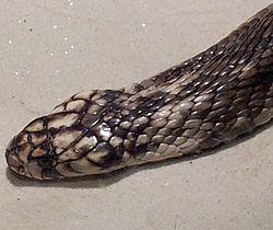 The Naja haje was first described by Swedish zoologist Carl Linnaeus in 1758. The generic name naja is a Latinisation of the Sanskrit word nāgá (नाग) meaning "cobra". The specific epithet haje is derived from the Arabic word hayya (حية) which literally means "snake".[4] The snouted cobra (Naja annulifera) and Anchieta's cobra (Naja anchietae) were formerly regarded as subspecies of Naja haje, but have since been shown to be distinct species.[5][6] The Arabian populations were long recognised as a separate subspecies, Naja haje arabica, and the black populations from Morocco sometimes as Naja haje legionis. A recent study[7] found that the Arabian cobra constitutes a separate species, Naja arabica, whereas the subspecies legionis was synonymised with N. haje. The same study also identified the West African savanna populations as a separate species and described it as Naja senegalensis.
