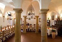 In the village heart is found a stone, vaulted cowshed. However, nowadays this historic groin-vaulted space is used as a winery's wine-tasting parlour.