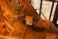 At first the legs were constructed as cantilevers but about halfway to the first level construction was paused in order to construct a substantial timber scaffold. This caused a renewal of the concerns about the structural soundness of the project, and sensational headlines such as "Eiffel Suicide!" and "Gustave Eiffel has gone mad: he has been confined in an Asylum" appeared in the popular press.[23] At this stage a small "creeper" crane was installed in each leg, designed to move up the tower as construction progressed and making use of the guides for the lifts which were to be fitted in each leg. The critical stage of joining the four legs at the first level was complete by March 1888. Although the metalwork had been prepared with the utmost precision, provision had been made to carry out small adjustments in order to precisely align the legs: hydraulic jacks were fitted to the shoes at the base of each leg, each capable of exerting a force of 800 tonnes, and in addition the legs had been intentionally constructed at a slightly steeper angle than necessary, being supported by sandboxes on the scaffold.