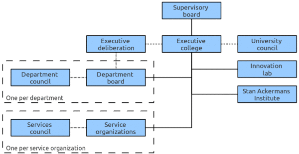 The day-to-day running of the university is in the hands of the Executive College (Dutch: College van Bestuur). The College provides oversight for the departments, the service organizations and the Innovation Lab, plus the local activities of the Stan Ackermans Institute. The College consists of three people, plus a secretary: