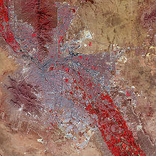 El Paso stands on the Rio Grande across the Mexico–United States border from Ciudad Juárez, the most-populous city in the Mexican state of Chihuahua with 1.4 million people.[9] Las Cruces, in the neighboring U.S. state of New Mexico, has a population of 215,579.[10] On the U.S. side, the El Paso metropolitan area forms part of the larger El Paso-Las Cruces combined statistical area, with a population of 1,060,397.[10]