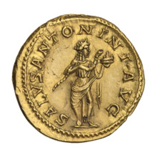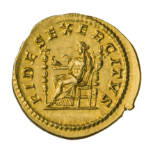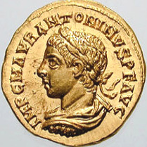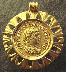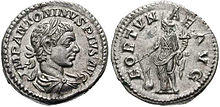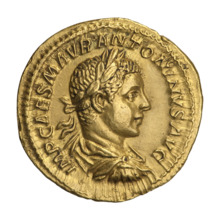 Under Elagabalus, the gradual devaluation of Roman aurei and denarii continued (with the silver purity of the denarius dropping from 58% to 46.5%),[60] though antoniniani had a higher metal content than under Caracalla.[61]