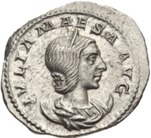 Herodian writes that when the emperor Macrinus came to power, he suppressed the threat to his reign from the family of his assassinated predecessor, Caracalla, by exiling them—Julia Maesa, her two daughters, and her eldest grandson Elagabalus—to their estate at Emesa in Syria.[27] Almost upon arrival in Syria, Maesa began a plot with her advisor and Elagabalus's tutor, Gannys, to overthrow Macrinus and elevate the fourteen-year-old Elagabalus to the imperial throne.[27]