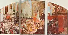 Next, according to Herodian, Elagabalus and his entourage spent the winter of 218–219 in Bithynia at Nicomedia, and then traveled through Thrace and Moesia to Italy in the first half of 219,[48] the year of Elagabalus's second consulship.[43] Herodian says that Elagabalus had a painting of himself sent ahead to Rome to be hung over a statue of the goddess Victoria in the Senate House so people would not be surprised by his Eastern garb, but it is unclear if such a painting actually existed, and Dio does not mention it.[51][52] If the painting was indeed hung over Victoria, it put senators in the position of seeming to make offerings to Elagabalus when they made offerings to Victoria.[50]