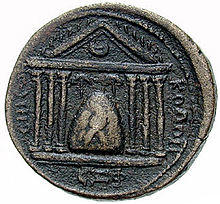 A lavish temple called the Elagabalium was built on the east face of the Palatine Hill to house Elagabal,[68] who was represented by a black conical meteorite from Emesa.[42] This was a baetylus. Herodian wrote "this stone is worshipped as though it were sent from heaven; on it there are some small projecting pieces and markings that are pointed out, which the people would like to believe are a rough picture of the sun, because this is how they see them".[69]