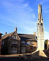 Eleanor's bier spent the night of either 6 or 7 December 1290, or possibly both, in Geddington, Northamptonshire.[34][35] The master mason for the cross here is not known: it was probably constructed in 1294 or 1295. It was recorded by William Camden in 1607;[46] and still stands in the centre of the village, the best-preserved of the three survivors.[47] It is unique among the three in having a triangular plan, and a taller and more slender profile with a lower tier entirely covered with rosette diapering, instead of the arch-and-gable motif with tracery which appears on both the others; and canopied statues surmounted by a slender hexagonal pinnacle.[48] It is possible that the other northern crosses (Lincoln, Grantham and Stamford) were in a similar relatively simple style; and that this reflects either the need to cut back expenditure in the latter stages of the project for financial reasons,[49] or a decision taken at the planning stage to make the crosses progressively larger and more ornate as the sequence proceeded south.[50]