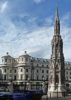 - The Queen Eleanor Memorial Cross at Charing Cross in London was erected in 1865 outside Charing Cross railway station on the Strand, a few hundred yards to the east of the site of the medieval cross. It does not pretend to be a faithful copy of the original, being larger and more ornate. It stands 70 ft (21 m) high and was commissioned by the South Eastern Railway Company for their newly opened Charing Cross Hotel. The cross was designed by the hotel architect, E. M. Barry, who is also known for his work on Covent Garden. It was constructed by Thomas Earp of Lambeth from Portland stone, Mansfield stone (a fine sandstone) and Aberdeen granite.[121] It was restored to a substantial extent in 2009–10.[122]