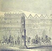 Although a number of images of the cross and its eventual destruction are known, these all postdate its various refurbishments, and so provide no certain guide to its original appearance.[97] However, the chronicler Walter of Guisborough refers to this and Charing Cross as being fashioned of "marble"; and it is likely that it was similar to the Hardingstone and Waltham Crosses, but even more ornate and boasting some Purbeck marble facings.[97][101]
