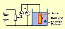To increase their capacitance per unit volume, all anode materials are either etched or sintered and have a rough surface structure with a much higher surface area compared to a smooth surface of the same area or the same volume. By applying a positive voltage to the above-mentioned anode material in an electrolytic bath an oxide barrier layer with a thickness corresponding to the applied voltage will be formed (formation). This oxide layer acts as dielectric in an electrolytic capacitor. The properties of this oxide layers are given in the following table:
