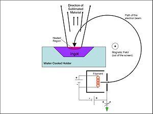 In an EBPVD system, the deposition chamber must be evacuated to a pressure of at least 7.5×10−5 Torr (10−2 Pa) to allow passage of electrons from the electron gun to the evaporation material, which can be in the form of an ingot or rod.[1] Alternatively, some modern EBPVD systems utilize an arc-suppression system and can be operated at vacuum levels as low as 5.0×10−3 Torr, for situations such as parallel use with magnetron sputtering.[2] Multiple types of evaporation materials and electron guns can be used simultaneously in a single EBPVD system, each having a power from tens to hundreds of kilowatts. Electron beams can be generated by thermionic emission, field electron emission or the anodic arc method. The generated electron beam is accelerated to a high kinetic energy and directed towards the evaporation material. Upon striking the evaporation material, the electrons will lose their energy very rapidly.[3] The kinetic energy of the electrons is converted into other forms of energy through interactions with the evaporation material. The thermal energy that is produced heats up the evaporation material causing it to melt or sublimate. Once temperature and vacuum level are sufficiently high, vapor will result from the melt or solid. The resulting vapor can then be used to coat surfaces. Accelerating voltages can be between 3 and 40 kV. When the accelerating voltage is 20–25 kV and the beam current is a few amperes, 85% of the electron's kinetic energy can be converted into thermal energy. Some of the incident electron energy is lost through the production of X-rays and secondary electron emission.