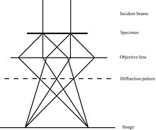 Figure 1 to the right is a simple sketch of the path of a parallel beam of electrons in a TEM from just above the sample and down the column to the fluorescent screen. As the electrons pass through the sample, they are scattered by the electrostatic potential set up by the constituent elements. After the electrons have left the sample they pass through the electromagnetic objective lens. This lens acts to collect all electrons scattered from one point of the sample in one point on the fluorescent screen, causing an image of the sample to be formed. We note that at the dashed line in the figure, electrons scattered in the same direction by the sample are collected into a single point. This is the back focal plane of the microscope, and is where the diffraction pattern is formed. By manipulating the magnetic lenses of the microscope, the diffraction pattern may be observed by projecting it onto the screen instead of the image. An example of what a diffraction pattern obtained in this way may look like is shown in figure 2.