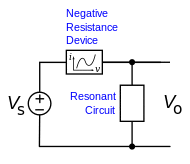 The negative-resistance oscillator model is not limited to one-port devices like diodes; feedback oscillator circuits with two-port amplifying devices such as transistors and tubes also have negative resistance.[6][7][8] At high frequencies, three terminal devices such as transistors and FETs are also used in negative resistance oscillators. At high frequencies these devices do not need a feedback loop, but with certain loads applied to one port can become unstable at the other port and show negative resistance due to internal feedback. The negative resistance port is connected to a tuned circuit or resonant cavity, causing them to oscillate.[6][7][9] High-frequency oscillators in general are designed using negative-resistance techniques.[6][7][8]