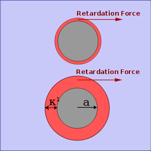The Smoluchowski theory is very powerful because it works for dispersed particles of any shape at any concentration. It has limitations on its validity. It follows, for instance, because it does not include Debye length κ−1 (units m). However, Debye length must be important for electrophoresis, as follows immediately from the Figure on the right. Increasing thickness of the double layer (DL) leads to removing the point of retardation force further from the particle surface. The thicker the DL, the smaller the retardation force must be.