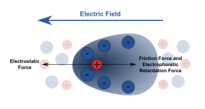 Suspended particles have an electric surface charge, strongly affected by surface adsorbed species,[9] on which an external electric field exerts an electrostatic Coulomb force. According to the double layer theory, all surface charges in fluids are screened by a diffuse layer of ions, which has the same absolute charge but opposite sign with respect to that of the surface charge. The electric field also exerts a force on the ions in the diffuse layer which has direction opposite to that acting on the surface charge. This latter force is not actually applied to the particle, but to the ions in the diffuse layer located at some distance from the particle surface, and part of it is transferred all the way to the particle surface through viscous stress. This part of the force is also called electrophoretic retardation force. When the electric field is applied and the charged particle to be analyzed is at steady movement through the diffuse layer, the total resulting force is zero :