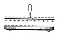 The electrophorus consists of a dielectric plate (originally a 'cake' of resinous material such as pitch or wax (in modern versions plastic is used) and a metal plate with an insulating handle.[9] The dielectric plate is first charged through the triboelectric effect by rubbing it with fur or cloth. For this discussion, imagine the dielectric gains negative charge by rubbing, as in the illustration below. The metal plate is then placed onto the dielectric plate. The dielectric does not transfer a significant fraction of its surface charge to the metal because the microscopic contact is poor. Instead the electrostatic field of the charged dielectric causes the charges in the metal plate to separate. It develops two regions of charge—the positive charges in the plate are attracted to the side facing down toward the dielectric, charging it positively, while the negative charges are repelled to the side facing up, charging it negatively, with the plate remaining electrically neutral as a whole. Then, the side facing up is momentarily grounded (which can be done by touching it with a finger), draining off the negative charge. Finally, the metal plate, now carrying only one sign of charge (positive in our example), is lifted.[4]