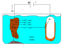In electrowinning, a current is passed from an inert anode through a liquid leach solution containing the metal so that the metal is extracted as it is deposited in an electroplating process onto the cathode. In electrorefining, the anodes consist of unrefined impure metal, and as the current passes through the acidic electrolyte the anodes are corroded into the solution so that the electroplating process deposits refined pure metal onto the cathodes.[1]