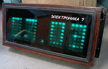 Electronics 7 is a Soviet Russian brand of seven-segment industrial digital clocks with four or eleven seven-segment luminescent digits. It had a separate binary-to-seven-segment decoder board for each digit, while the actual timekeeping was done by a main board which emitted the digits of the time as binary code. Most models used Russian-made vacuum-fluorescent indicators, but there were also models based on light-emitting diodes. All the street and wall clocks were based on a kit produced by the "Reflector" factory in Saratov, and many remain in use at administrative and industrial premises in Russia.