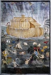 Nicholas Birns, a scholar of literature, notes Elendil's survival of Númenor's fall, an event that recalls to him both Plato's Atlantis and the Biblical fall of man; he notes that Tolkien called Elendil a "Noachian figure",[T 5] an echo of the biblical Noah.[1] Tolkien explains that Elendil "held off" from the Númenórean rebellion, and had kept ships ready; he "flees before the overwhelming storm of the wrath of the West [from Valinor], and is borne high upon the towering waves that bring ruin to the west of the Middle-earth."[T 5] Birns notes that Elendil, who he calls a hugely important figure in Middle-earth, must be later "in comparative time" than Noah; where Noah was a refugee, Elendil was "an imperialist, a founder of realms". However, he grants that "Noachian" implies a class of people like Noah, and the possibility of different kinds of flood. Birns comments that Middle-earth has its Creation and Flood myths, but not exactly a fall of man. He suggests that Tolkien, as a Catholic, may have been more comfortable working with the forces of nature seen in Creation and Flood, but preferred to leave the fall alone; he notes that both Creation and Flood are found in non-Christian tales from the Middle East, citing the Epic of Gilgamesh for the Flood and the Enuma Elish for Creation.[1]