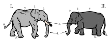 The skeleton of the elephant is made up of 326–351 bones.[36] The vertebrae are connected by tight joints, which limit the backbone's flexibility. African elephants have 21 pairs of ribs, while Asian elephants have 19 or 20 pairs.[37]