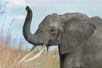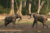 Among African elephants, forest elephants have smaller and more rounded ears and thinner and straighter tusks than bush elephants and are limited in range to the forested areas of western and Central Africa.[12] Both kinds of elephant were traditionally considered to be the same species Loxodonta africana, but molecular studies have affirmed their status as separate species.[13][14][15] In 2017, DNA sequence analysis showed that L. cyclotis is more closely related to the extinct Palaeoloxodon antiquus, than it is to L. africana, possibly undermining the genus Loxodonta as a whole.[16]