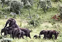 Elephants typically coexist peacefully with other herbivores, which will usually stay out of their way. Some aggressive interactions between elephants and rhinoceros have been recorded. At Aberdare National Park, Kenya, a rhino attacked an elephant calf and was killed by the other elephants in the group.[78] At Hluhluwe–Umfolozi Game Reserve, South Africa, introduced young orphan elephants went on a killing spree that claimed the lives of 36 rhinos during the 1990s, but ended with the introduction of older males.[85] The size of adult elephants makes them nearly invulnerable to predators,[76] though there are rare reports of adult elephants falling prey to tigers.[86] Calves may be preyed on by lions, spotted hyenas, and wild dogs in Africa[87] and tigers in Asia.[76] The lions of Savuti, Botswana, have adapted to hunting elephants, mostly calves, juveniles or even sub-adults, during the dry season, and a pride of 30 lions has been normally recorded killing juvenile individuals between the ages of four and eleven years, and a bull of about 15 years in an exceptional case.[88][89] Elephants appear to distinguish between the growls of larger predators like tigers and smaller predators like leopards (which have not been recorded killing calves); they react to leopards less fearfully and more aggressively.[90] Elephants tend to have high numbers of parasites, particularly nematodes, compared to other herbivores. This is due to lower predation pressures that would otherwise kill off many of the individuals with significant parasite loads.[91]