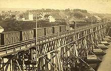 In 1863 a wooden railway bridge was constructed at that location for the Trondhjem-Størenbanen railway line to Trondheim. This bridge was called "Kongsgårds bro". The railway bridge was converted into a roadway bridge in 1885, after the train station was relocated to Brattøra.[2]