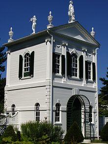 The early merchant barons of Salem intermarried endlessly. George Crowninshield married Mary Derby, sister of Elias Hasket Derby, who married in 1761 Elizabeth Crowninshield, George Crownshield's sister.[7] Their eldest daughter, Elizabeth, married (eloped with) Captain Nathaniel West of Salem; their marriage ended in an ugly, very public divorce in 1806 (West v. West). Elizabeth was awarded a great sum of alimony, and moved to Danvers, where she inherited a country seat from her father, which was known as Oak Hill, where currently the North Shore Mall is located. Her sister, Anstiss Derby married merchant Benjamin Pickman. The son of Benjamin Pickman and Anstiss Derby was Hasket Derby Pickman, Harvard Class of 1815, who died the same year he graduated from college.
