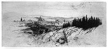 After a few years, Greatorex turned away from painting and devoted herself primarily to pen-and-ink sketches and etchings, many of which appeared in book form.[9] The bulk of her sketches were made during several trips to Europe in the 1860s and 1870s and tend toward conventional views of buildings and landscapes. In 1870–1872, she visited Nuremberg and Ober-Ammergau, Germany; Munich, Austria; and various parts of Italy. The Nuremberg and Ober-Ammergau trips led to the publication of Etchings in Nuremberg (1873) and The Homes of Ober-Ammergau (1873).[2] Her large pen-and-ink drawing of Albrecht Durer's house in Nuremberg is now in the Vatican in Rome.[6]