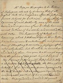 Elizabeth Montagu published two works in her lifetime. George Lyttleton in 1760 encouraged Elizabeth to write Dialogues of the Dead, and she contributed three sections to the work anonymously. (Her authorship is testified elsewhere.) It consists of a series of conversations between the living and the illustrious dead, and works as a satire of 18th-century vanity and manners. In 1769, she published An Essay on the Writings and Genius of Shakespear. In it, she proclaims Shakespeare to be the greatest English poet, and in fact the greatest poet of any nation. She also attacks Samuel Johnson's 1765 Preface to Shakespeare for not having gone on to praise Shakespeare's plays enough. While Johnson had dealt with text, history, and the circumstances of editing, Montagu wrote instead about the characters, plots, and beauties of the verse in Shakespeare and saw in him a championing of all things inherently English. When the book was initially published anonymously, it was thought to be by Joseph Warton, but by 1777 her name appeared on the title page. Johnson, for his part, was estranged from Montagu at this point.
